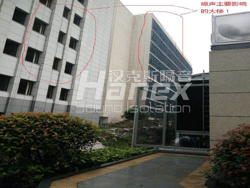 在冷卻塔四周一定的距離整體設置隔音屏障,隔音屏障底部鏤空,底部鏤空高度不少于1.2m。由于東面距離住宅樓原,且存在消聲器遮擋等作用,其鏤空高度可以更高。東面封死。